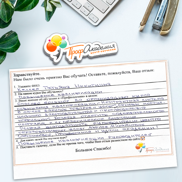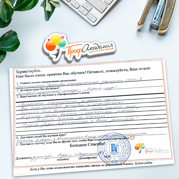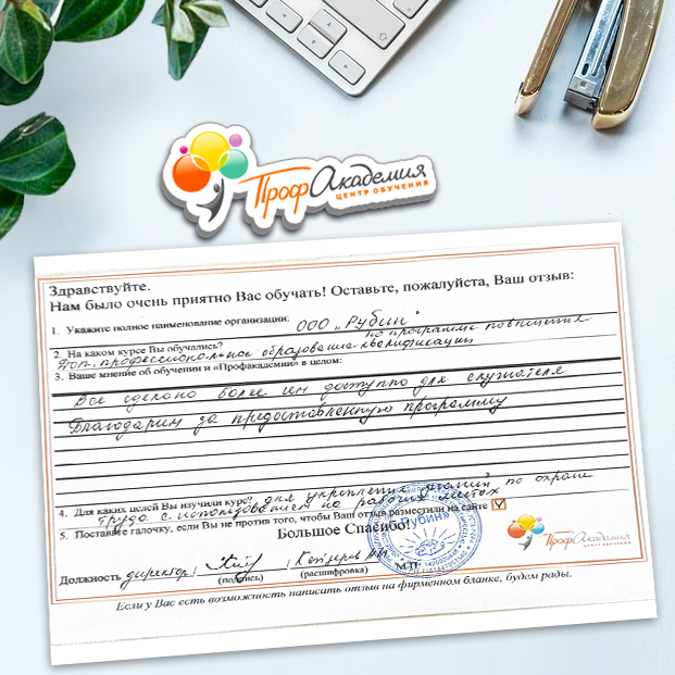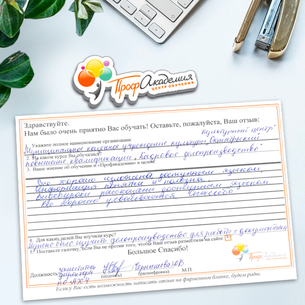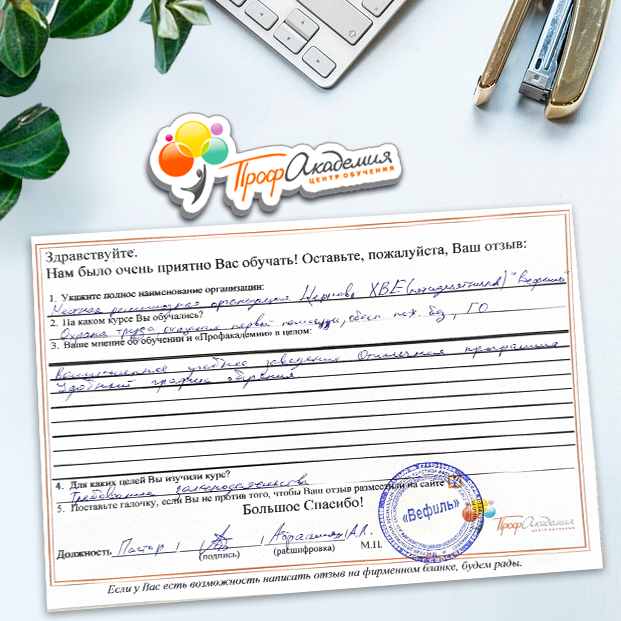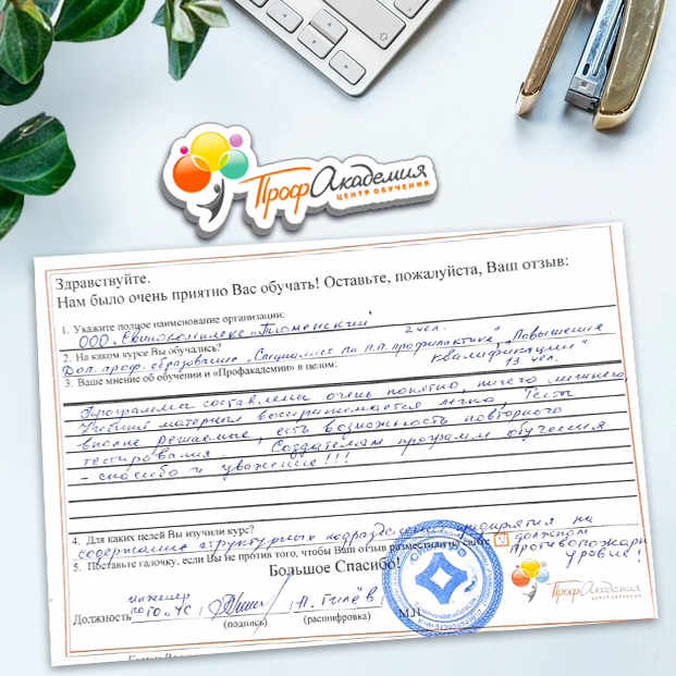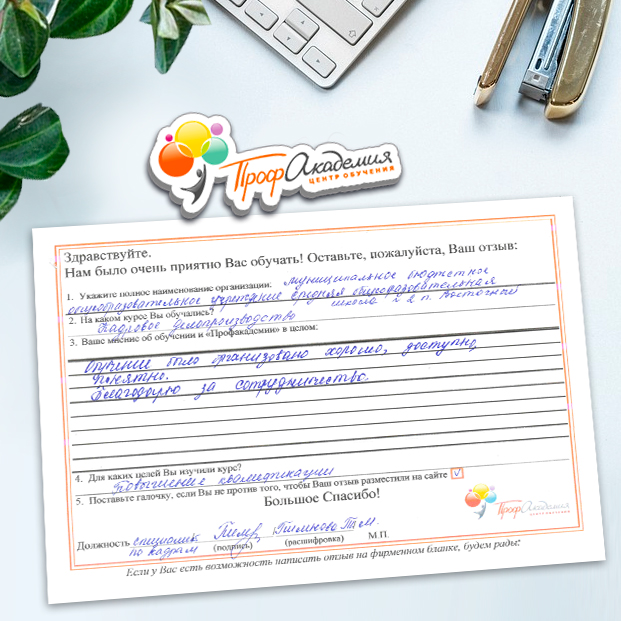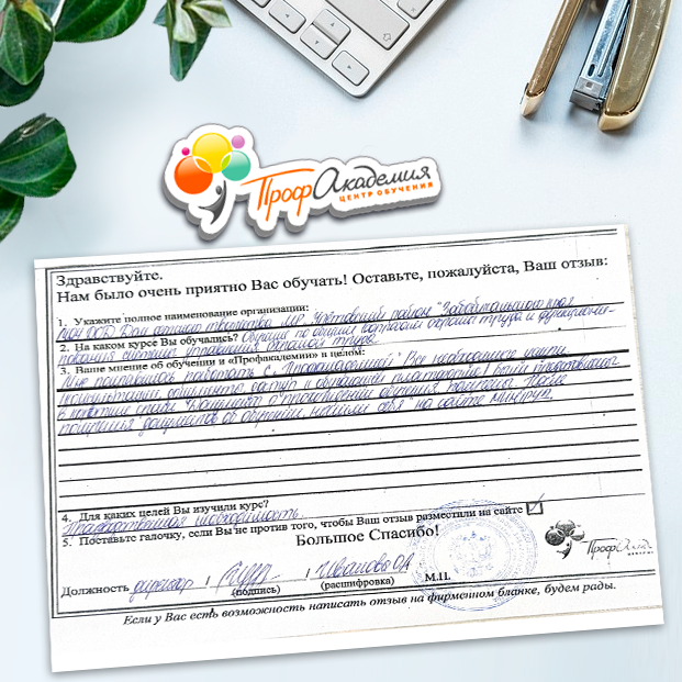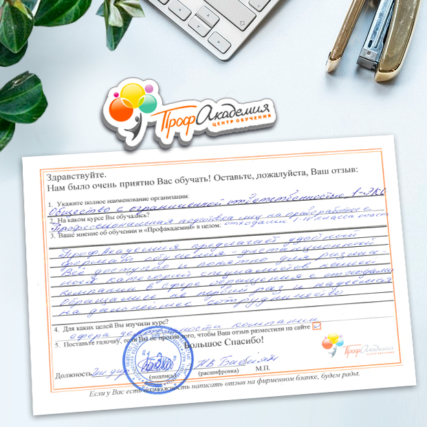 Для прохождения дополнительного профессионального образования для руководителя обращаемся в Профакадемию почти 10 лет. Хотим отметить высокий профессионализм сотрудников, доброжелательность и надежность. Команда работает качественно, без задержек и накладок. Спасибо за ваш труд! Успехов и процветания!