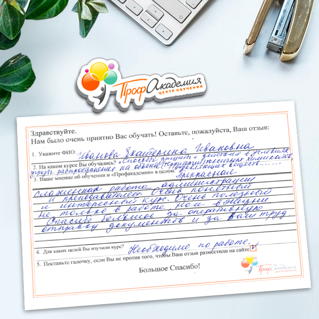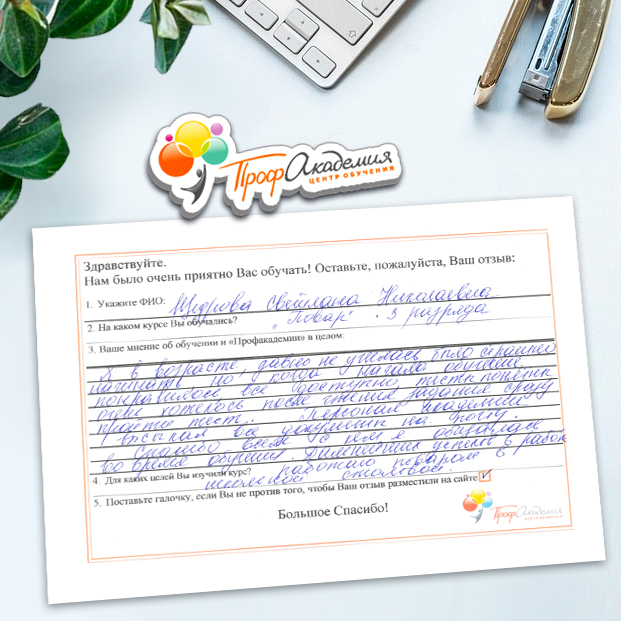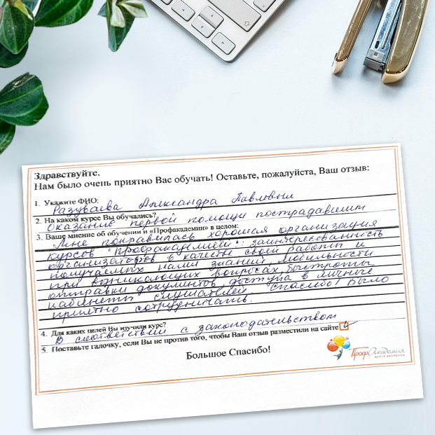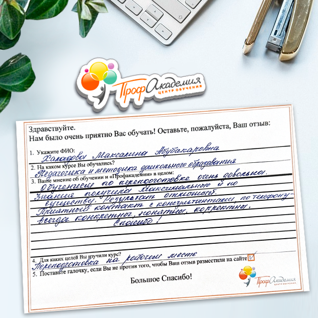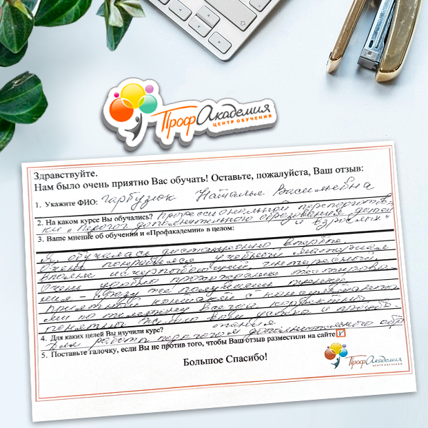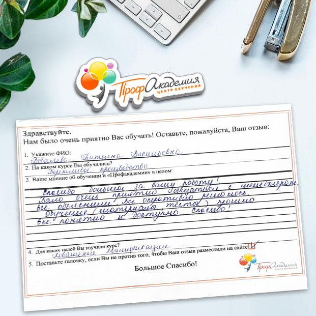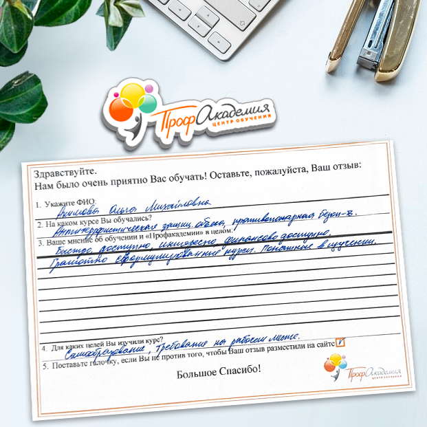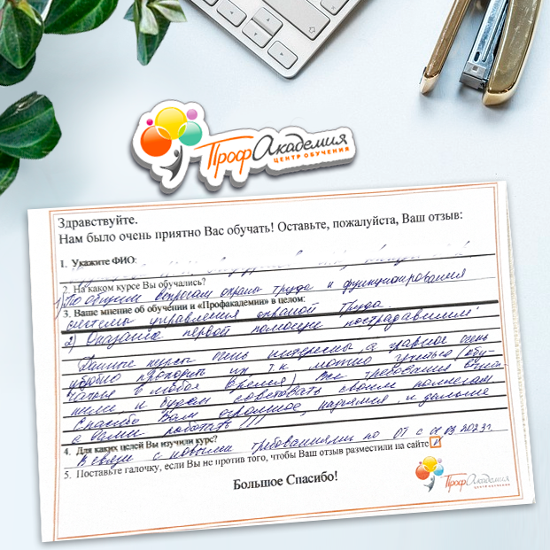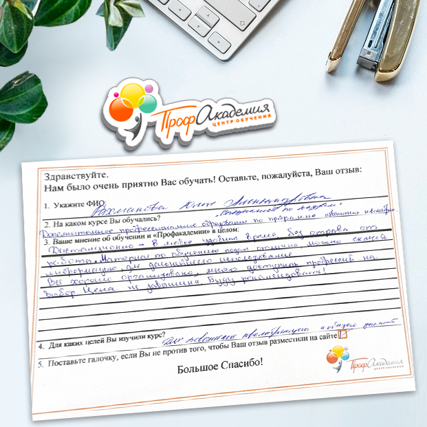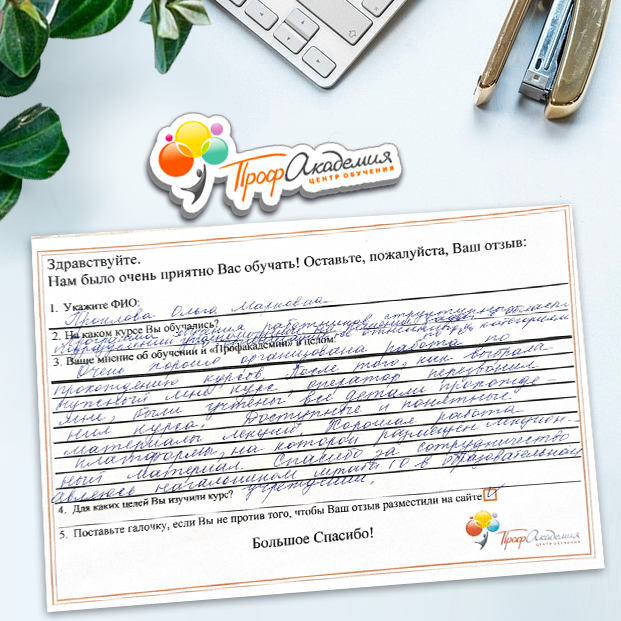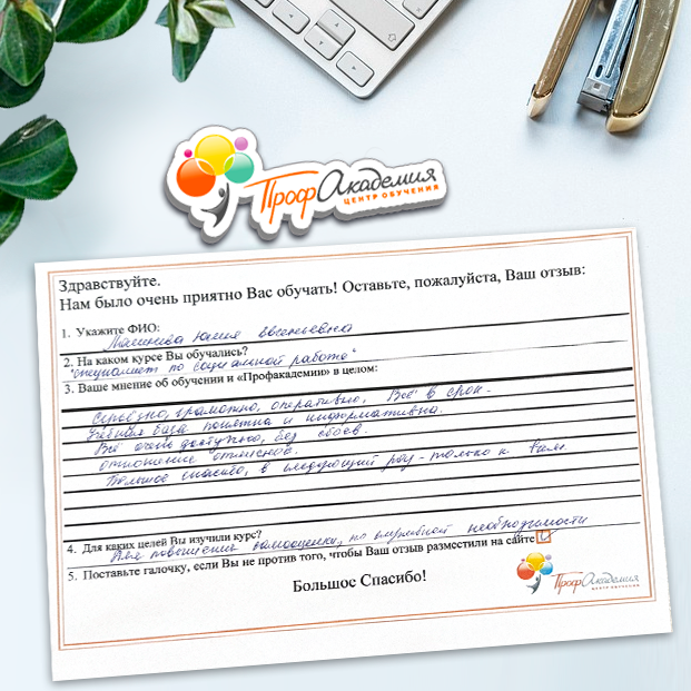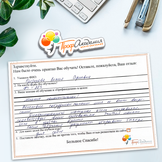Очень приятно обучаться в "Профакадемии", все очень точно, быстро, внятно. Получила свое удостоверение, спасибо большое.