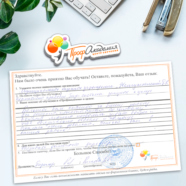 Обучение построено грамотно, в курсы включены вопросы со всеми изменениями в законодательстве. Большое спасибо!