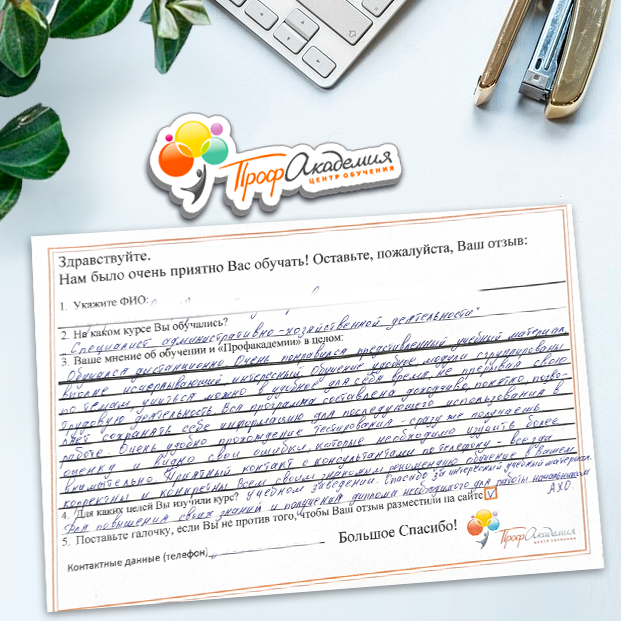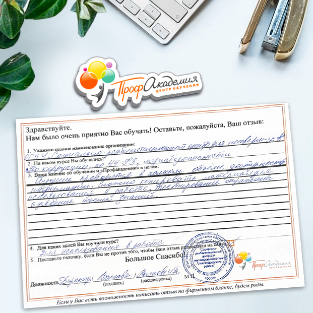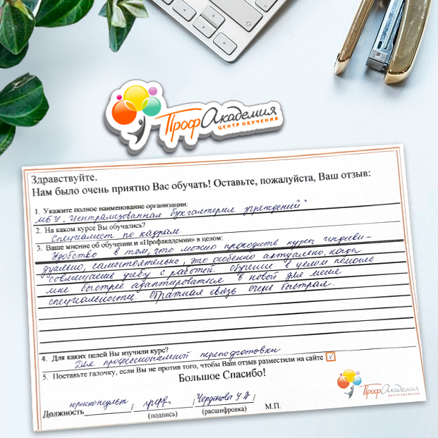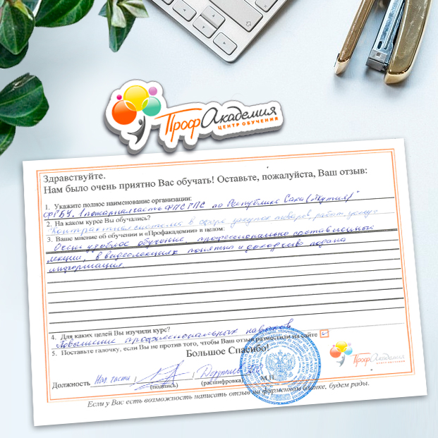 Не первый год сотрудничаем с "Профессиональной Академией". Хочется отметить сотрудников Академии за отзывчивость и оперативность в работе, и за доброжелательность к обращающимся к ним людям. Обучение - понятное и эффективное. Спасибо большое.