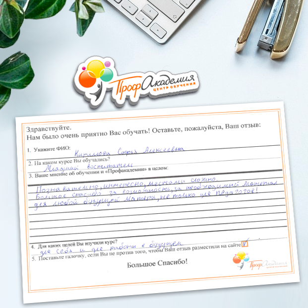 Слаженная работа администрации и преподавателей. Очень понятный и интересный курс. Очень полезный не только в работе, но и в жизни. Спасибо большое за оперативную отправку документов и за ваш труд.