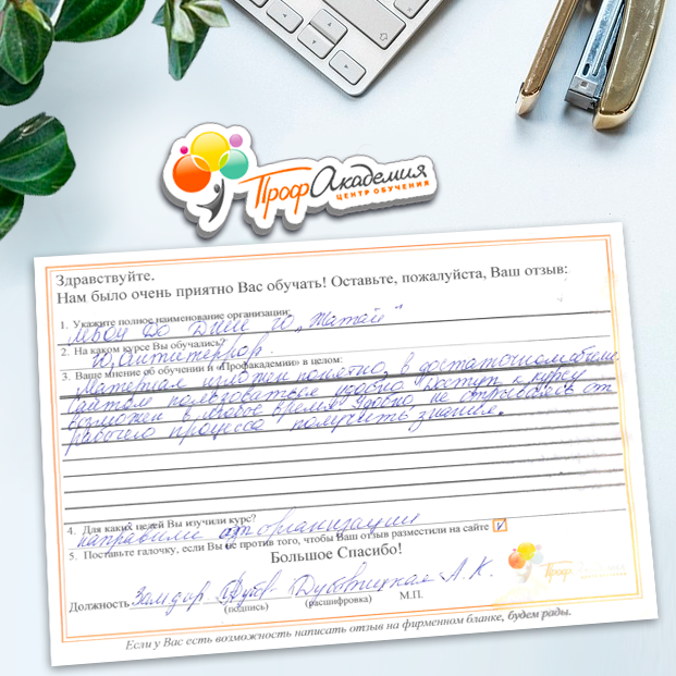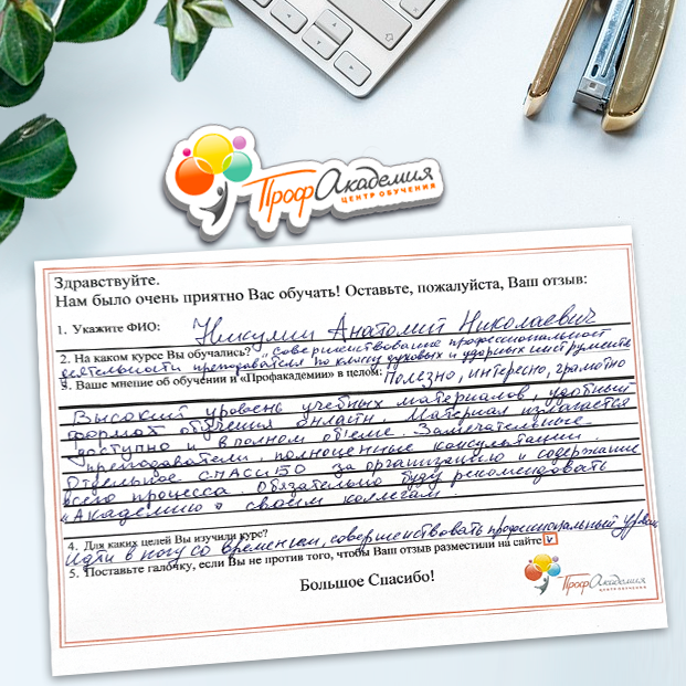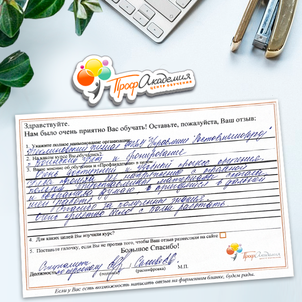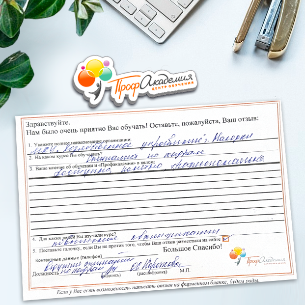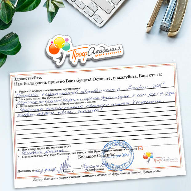 Наши сотрудники неоднократно проходили обучение в Вашей академии и с огромным удовольствием вернемся к Вам снова. Все доступно, понятно и отлично! Большое спасибо!