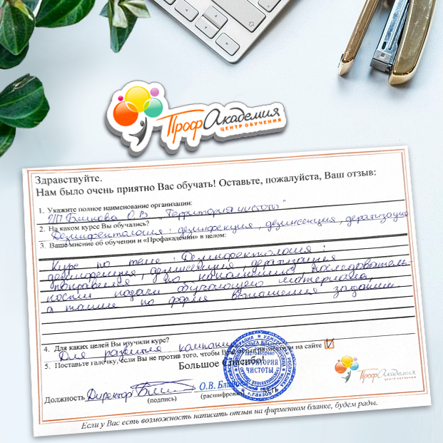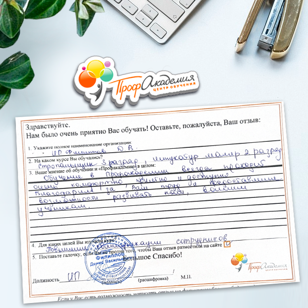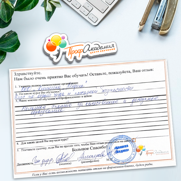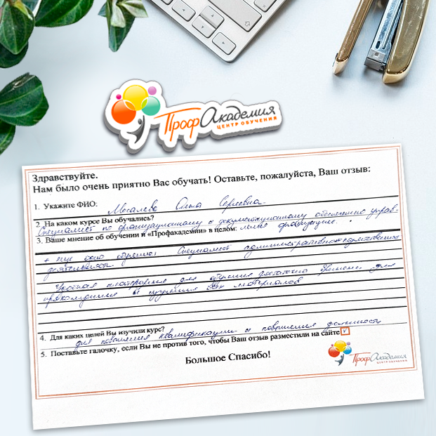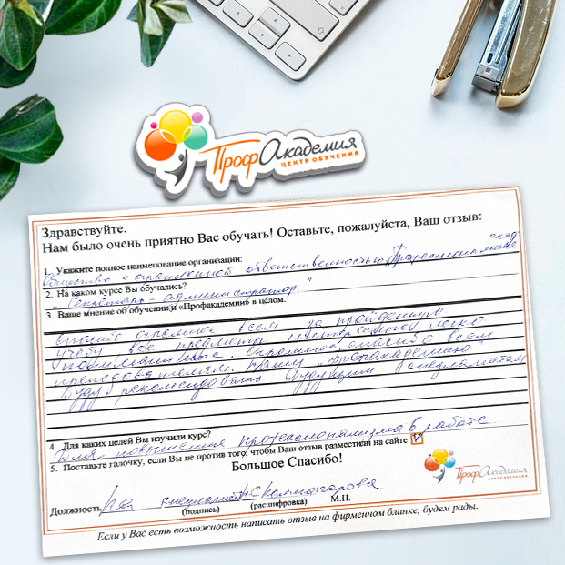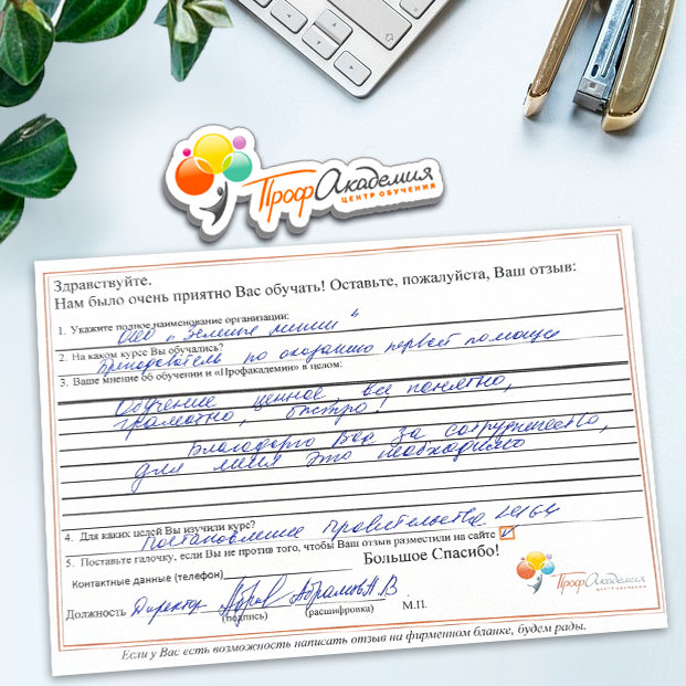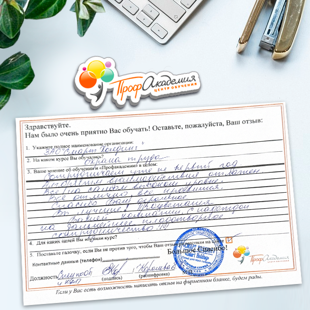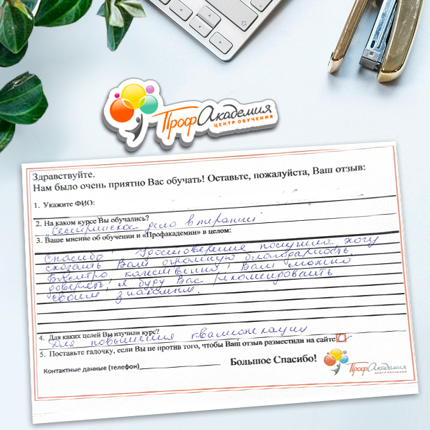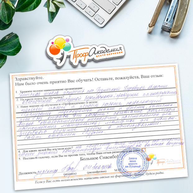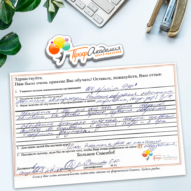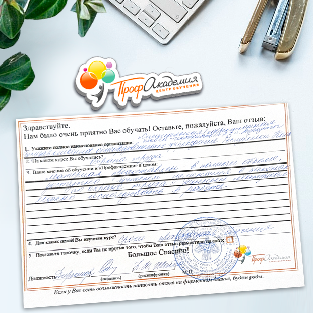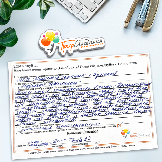 Спасибо Профакадемии за доступное обучение, наши сотрудники с легкостью прошли все курсы, информация в виде презентаций изложена очень четко, лаконично и быстро усваиваться. Мы уже стали Вашими постоянными учениками, будем и дальше взаимодействовать. С вами приятно работать