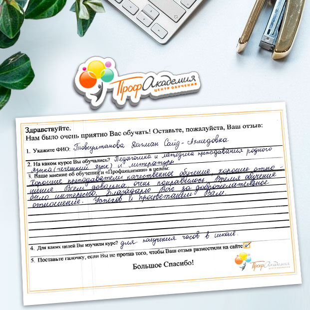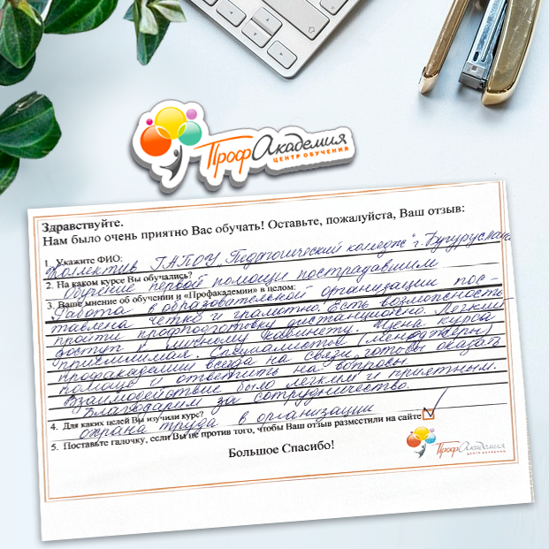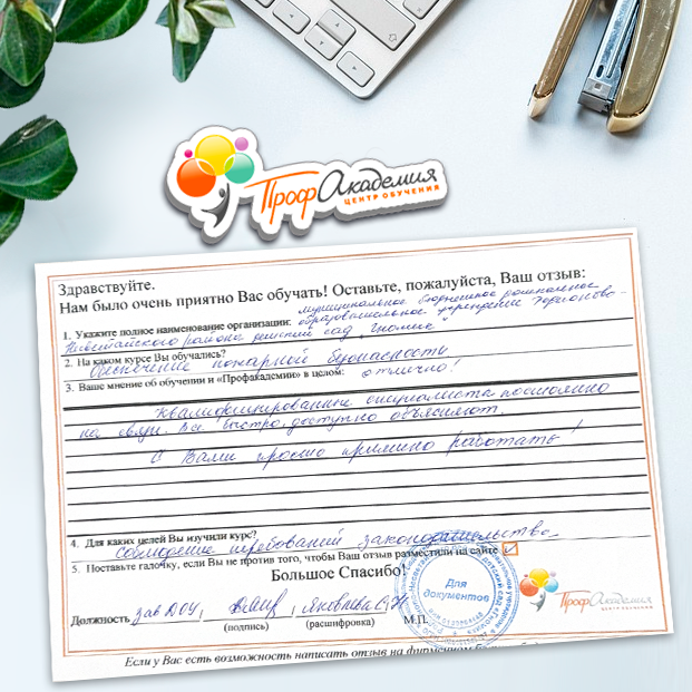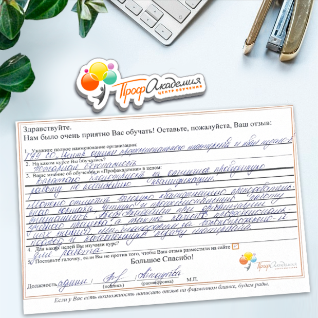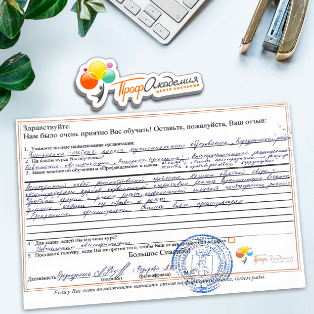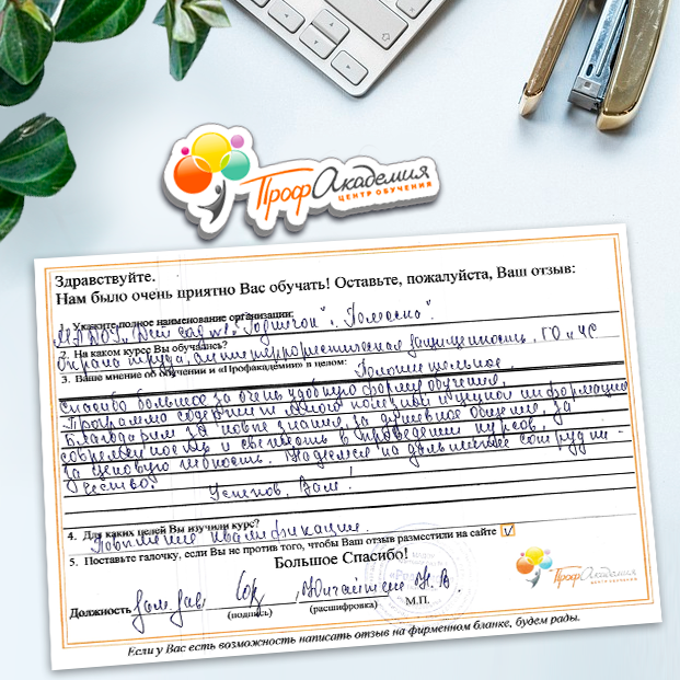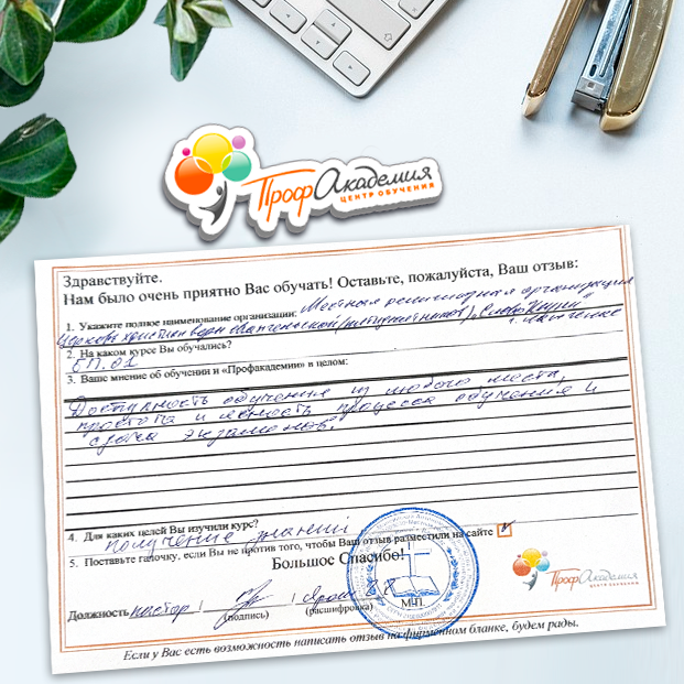 Выражаю благодарность за отлично проведенную работу по повышению квалификации. Можно отметить высокую квалификацию преподавательского состава, четкую и профессиональную работу специалистов "Профакадемии" при организации учебного процесса, а также качество профессиональных знаний. Мы благодарим за высокопрофессиональный подход и качественную подачу материала