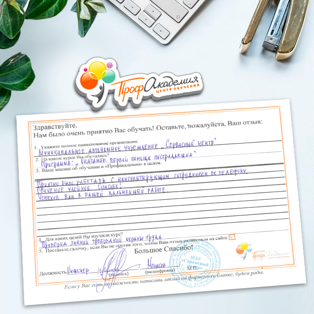 Все очень хорошо организовано, начиная от момента заключения договора и заканчивая самим обучением. Содержание самих учебных блоков для нашего сотрудника было полезным, ей понравилось. Спасибо, с Вами приятно было работать!