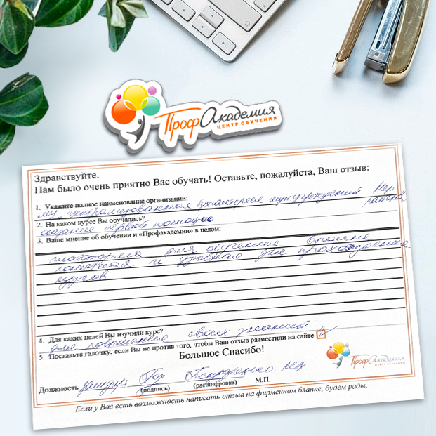 Обучение в "Профакадемия" стало для нас одним из важнейших этапов в нашей библиотечной жизни и всего Учреждения в целом. Высокая квалификация преподавателей и база знаний помогают нам сегодня в работе. Ваши педагоги компетентные, доброжелательные, грамотные и знающие свое дело. Те знания, которые вы нам даете, действительно, очень помогают в работе. Хотим выразить огромную благодарность всему вашему коллективу за внимание, знания, прекрасное отношение. Желаем ООО "Профакадемия" дальнейшего процветания и дальнейшего сотрудничества!